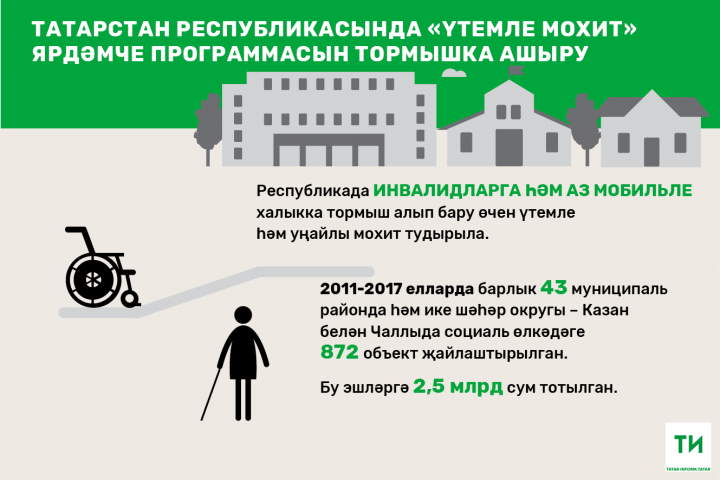 2011-2017 елларда республиканың бөтен 45 район һәм шәһәр округында да социаль өлкәдәге барлыгы 872 объектта аз мобильле гражданнар өчен уңайлы шартлар тудырылган. Әлеге эшләрне финанслау 2,6 миллиард сумны тәшкил иткән.